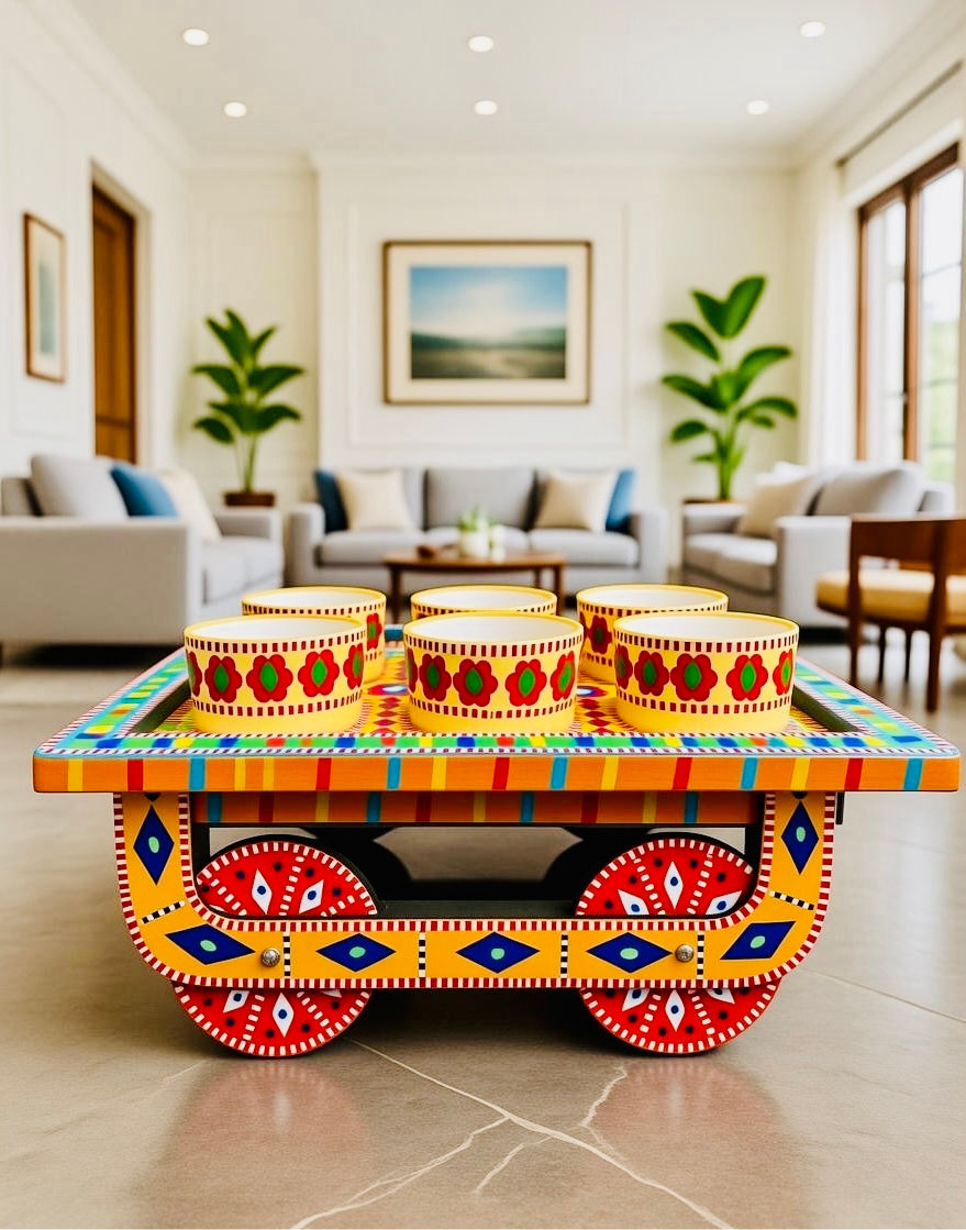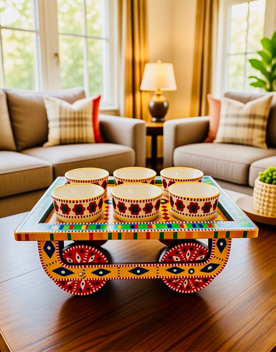 This bowl thaila tray with moving wheels is designed for easy serving and mobility. It features a sturdy tray base with smooth-rolling wheels, making it simple to move bowls, snacks, or serving items from one place to another. Practical and stylish, it is ideal for home use, gatherings, and serving purposes.