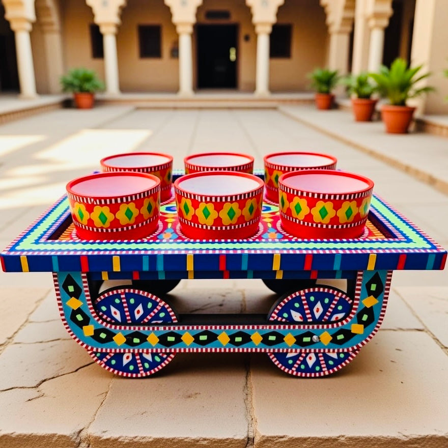 This bowl thaila tray with moving wheels is designed for easy serving and mobility. It features a sturdy tray base with smooth-rolling wheels, making it simple to move bowls, snacks, or serving items from one place to another. Practical and stylish, it is ideal for home use, gatherings, and serving purposes.