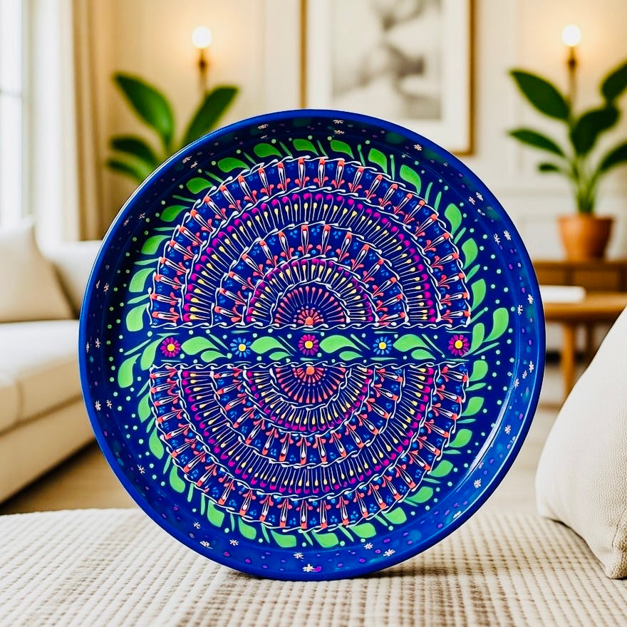 This beautiful Fine Art Round Serving Tray is a handcrafted expression of traditional Pakistani Truck Art, featuring vibrant colors and detailed circular patterns that create a striking visual appeal. The deep blue base is enriched with hand-painted floral and geometric motifs, symbolizing harmony, culture, and artistic balance.