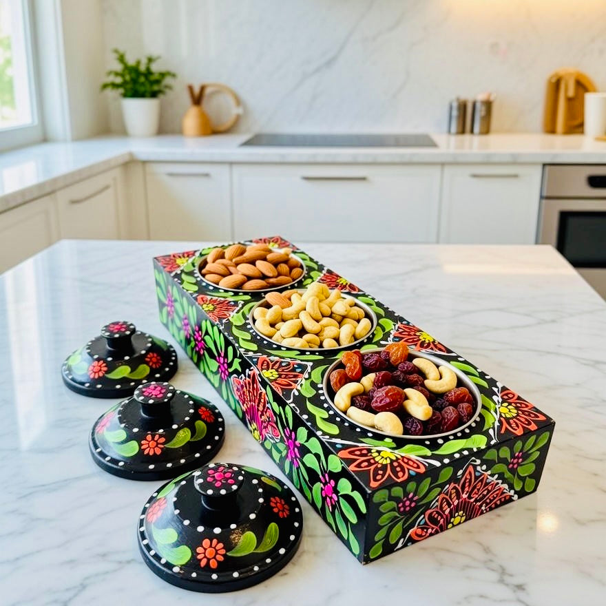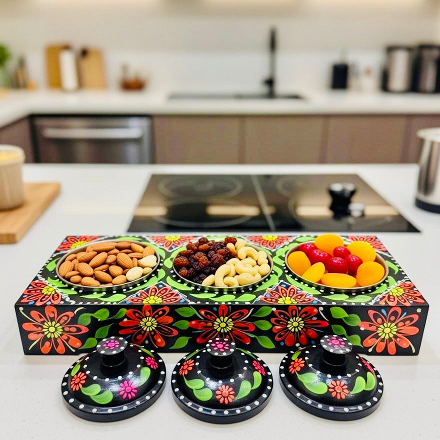 This exquisite Fine Art Three Partition Handmade Tray is a perfect blend of traditional craftsmanship and artistic elegance. Carefully handcrafted by skilled artisans, the tray features three well-balanced compartments, ideal for serving dry fruits, spices, condiments, or small snacks in a refined and organized manner.